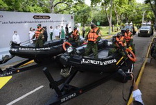 Este contingente estuvo respaldado por una escolta montada con bandera monumental, siete guiones y una banda de guerra, así como por 40 vehículos terrestres de las referidas instituciones castrenses, dos embarcaciones con motor fuera de borda y una moto acuática.
