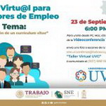 El taller virtual para buscadores de empleo con el tema: “Elaboración de un curriculum vitae”, se realizará este 23 de septiembre a las 6 de la tarde; los interesados podrán unirse mediante la modalidad en línea: Videoconferencia Telmex, desde una PC, Mac, IOS o Android, para lo cual deberán enviar una foto o escaneo de su INE al correo: see.urcardenas@tabasco.gob.mx con asunto: “Taller Virtual UVG” o comunicarse al teléfono 93 76 88 16 17.