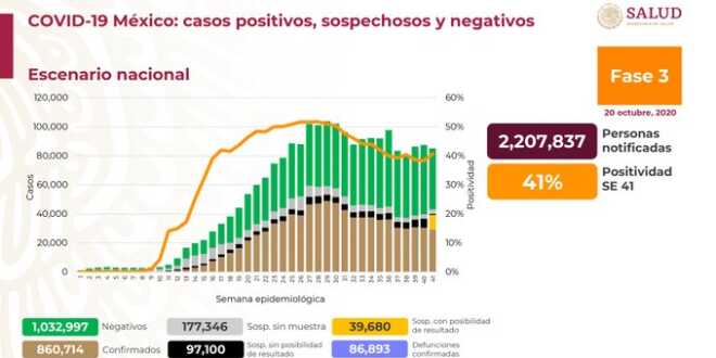Al 20 de octubre de 2020 hay 860,714 casos confirmados #COVID19. Se han registrado 1,032,997 negativos, 86,893 defunciones confirmadas y 627,584 personas recuperadas.