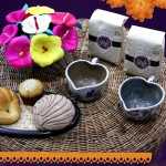 Así también la catrina y catrín choco, collares y aretes de calaveritas, aretes de catrinas, jícaras labradas y ahumadas, colgantes catrina, jícara cernidor ahumada, molinillo de madera, así como una gran variedad de chocolates para preparar y acompañar el pan de muerto.