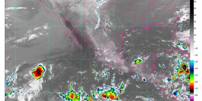 Para hoy, se prevén lluvias puntuales fuertes (de 25 a 50 milímetros [mm]) en Campeche, Chiapas, Quintana Roo, Tabasco y Yucatán; intervalos de chubascos (de 5.1 a 25 mm) en Colima, Guerrero, Jalisco, Michoacán, Nayarit, Oaxaca y Veracruz, y lluvias aisladas (de 0.1 a 5 mm) en Durango, Estado de México, Nuevo León, Puebla, Sinaloa y Tamaulipas.