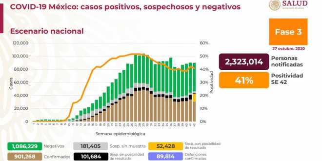 Al 27 de octubre de 2020 hay 901,268 casos confirmados #COVID19. Se han registrado 1,086,229 negativos, 89,814 defunciones confirmadas y 659,473 personas recuperadas.