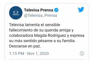 Con Profundo Pesar se informa el Lamentable Fallecimiento de la Productora Magda Rodríguez», fue el mensaje de Televisa que se unió al pésame de la pérdida.