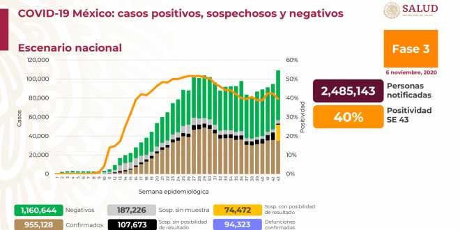 Al 06 de noviembre de 2020 hay 955,128 casos confirmados #COVID19. Se han registrado 1,160,644 negativos, 94,323 defunciones confirmadas y 706,267 personas recuperadas.