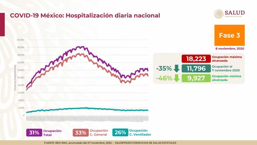 A nivel nacional, el 33% de camas de hospitalización general y el 26% de camas con ventiladores están ocupadas.