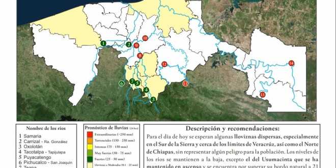 En su reporte matutino, Protección Civil apuntó que para este miércoles no se esperan lluvias significativas en la región, sólo “lloviznas dispersas”, especialmente en el Sur de la Sierra y cerca de los límites de Veracruz, así como en el Norte de Chiapas, sin representar algún peligro para la población.