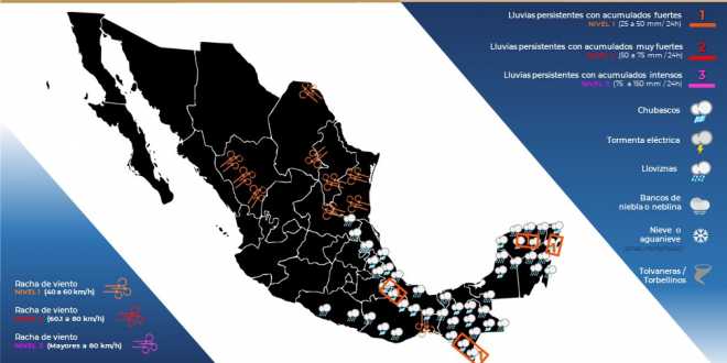 Asimismo, se prevén vientos del Norte Noreste de 5 a 25 kilómetros por hora y temperaturas entre los 32 y 35 grados Celsius las máximas y los 20 y 22 grados las mínimas.