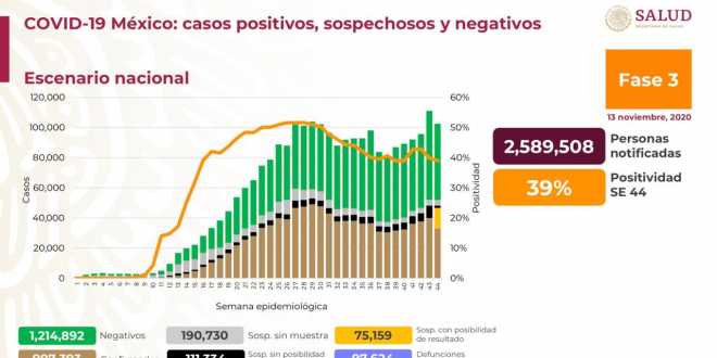Al 13 de noviembre de 2020 hay 997,393 casos confirmados #COVID19. Se han registrado 1,214,892 negativos, 97,624 defunciones confirmadas y 741,340 personas recuperadas.