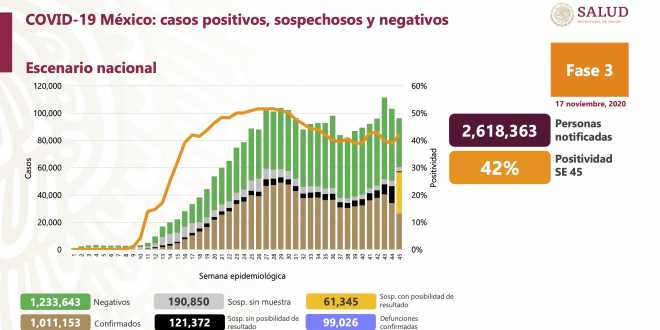 Al 17 de noviembre de 2020 hay 1,011,153 casos confirmados #COVID19. Se han registrado 1,233,643 negativos, 99,026 defunciones confirmadas y 757,951 personas recuperadas.