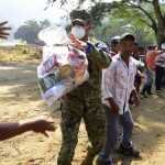 En el poblado Dos Montes, del municipio de Centro colaboraron uniformados de Sedena y del IPCET, para realizar la entrega de insumos a las familias albergadas en el refugio temporal, ubicado en la escuela primaria “Lic. Tomás Garrido Canabal”.