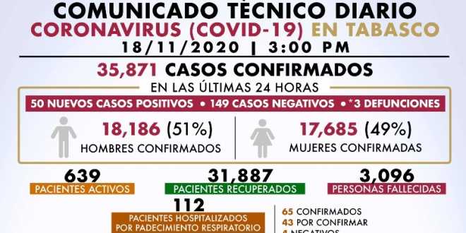 La dependencia informó que del total de pacientes hospitalizados 36 se encuentran en el Hospital Regional de Alta Especialidad “Dr. Juan Graham Casasús”; 21 en el ISSET; 14 en el IMSS, ocho en el UCAM del Hospital Rovirosa y siete en el Hospital Maximiliano Dorantes.