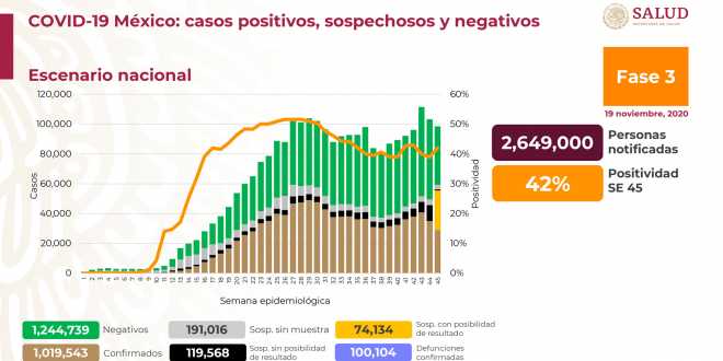 Al 19 de noviembre de 2020 hay 1,019,543 casos confirmados #COVID19. Se han registrado 1,244,739 negativos, 100,104 defunciones confirmadas y 766,361 personas recuperadas.