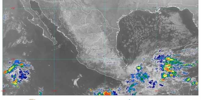 Para el Pacífico Sur, se pronostica ambiente muy caluroso en zonas costeras, cielo nublado, lluvias puntuales intensas en Chiapas y Oaxaca, viento de componente norte con rachas de 80 a 90 km/h en el Golfo e Istmo de Tehuantepec, así como oleaje elevado de 3 a 5 m de altura significante en dicho Golfo.