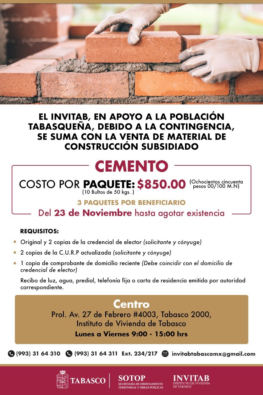 El apoyo que ofrece INVITAB, en coordinación con la Secretaría de Ordenamiento Territorial y Obras Públicas (Sotop), estará disponible a partir de este lunes y hasta agotar existencia, en los municipios de Centro, Cunduacán y Cárdenas.