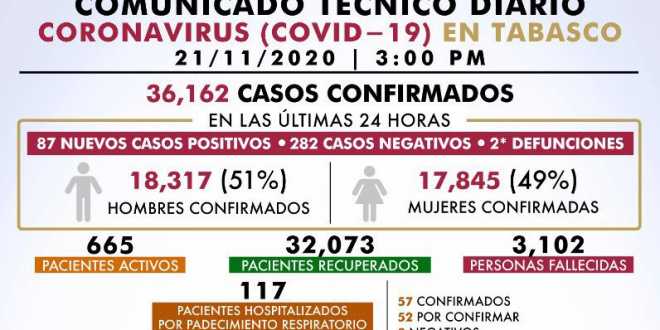 Salud dio a conocer que en lo que va de la pandemia, Tabasco acumula un total de 36 mil 162 casos confirmados de COVID, de los que 32 mil 73 contagiados ya se recuperaron del padecimiento.