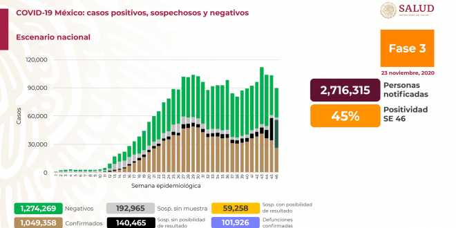 Al 23 de noviembre de 2020 hay 1,049,358 casos confirmados #COVID19. Se han registrado 1,274,269 negativos, 101,926 defunciones confirmadas y 784,693 personas recuperadas.