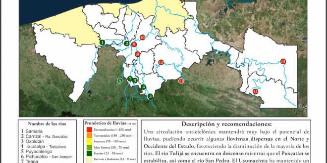 Dio a conocer que aunque hay ríos que todavía permanecen en estado de alerta por encontrarse arriba de su NAMO, como el De la Sierra, el Grijalva, el Tulijá, el Puxcatán y el San Pedro, todos mostraron tendencias a la baja en las últimas horas.
