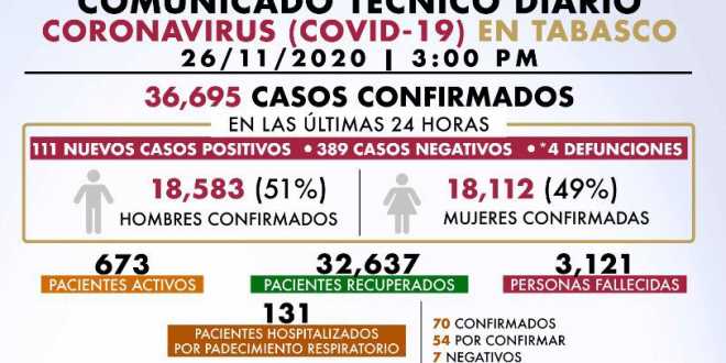 De acuerdo al Comunicado Técnico Diario, Tabasco registra 36 mil 695 casos confirmados, 3 mil 121 fallecimientos por SARS-CoV-2, así como 32 mil 637 pacientes recuperados, 673 activos y 131 hospitalizados por padecimientos respiratorios, de los cuales 70 resultaron positivos, 54 esperan los resultados de sus pruebas PCR y siete negativos.