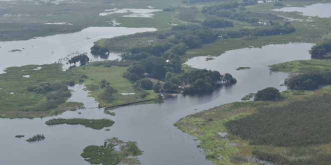 En una toma aérea pueden observarse los campos macuspanenses totalmente inundados; los ganaderos llegan a pagar hasta 250 pesos mensuales por el traslado de cada res a zonas secas o a ranchos no inundados.