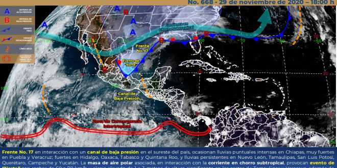 Dijo que durante este día se esperan pocas precipitaciones, pero por la noche o madrugada del lunes podrían combinarse la influencia del frente frío 17 con un canal de baja presión, favoreciendo lluvias moderadas a fuertes aisladas de 25.1 a 50 milímetros (mm) en la Sierra y la zona costera de Cárdenas, así como similares o superiores en el Norte de Chiapas.