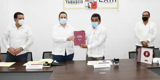 En representación del Gobierno del Estado y en cumplimiento a lo que establece el Artículo 27 de la Constitución Política del Estado de Tabasco, el coordinador general de Asuntos Jurídicos, Guillermo del Rivero León, entregó al Congreso del Estado el Paquete Económico 2021.