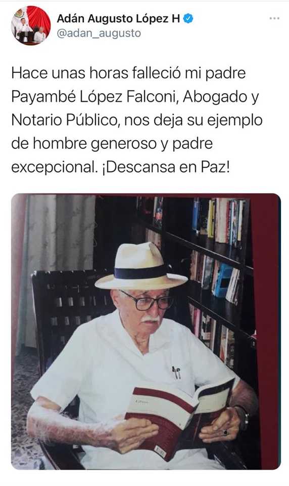 Empresarios, políticos, funcionarios del gabinete estatal y amigos expresaron su pésame al gobernador Adán Augusto López Hernández, tras el fallecimiento de su señor padre el abogado Payambé López Falconi, notario público No. 13.