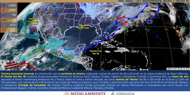 El Instituto de Protección Civil del Estado de Tabasco (IPCET), informó que la masa de aire asociada al frente frío número 18 mantendrá la entrada de humedad del Golfo de México, favoreciendo este día, un potencial de lluvias moderadas de 5.1 a 25 milímetros, con posibles fuertes de 25.1 a 50 milímetros en La Sierra.
