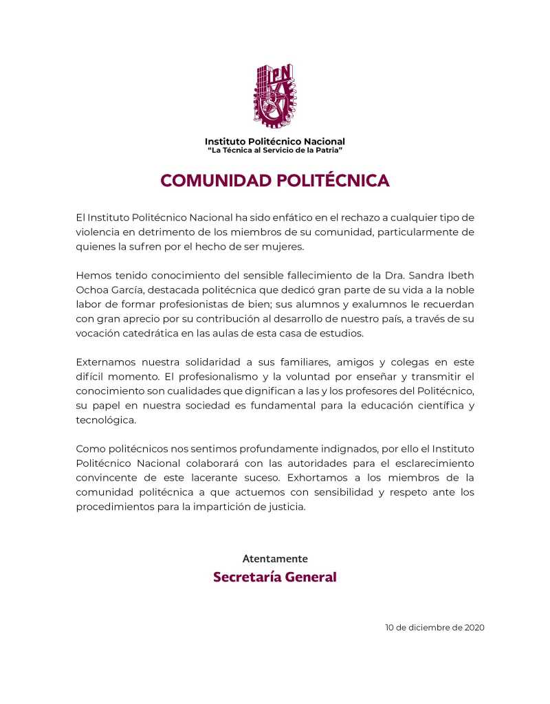 El 8 de diciembre Sandra Ibeth Ochoa García, maestra del IPN, fue reportada como desaparecida. Sin embargo, al día siguiente se anunció que su cuerpo había sido hallado sin vida.