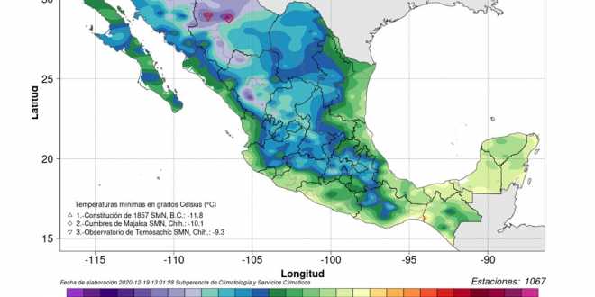 Durante la mañana, se pronostican temperaturas mínimas de -15 a -10 grados Celsius con heladas en montañas de Chihuahua y Durango; de -10 a -5 grados Celsius y heladas en zonas serranas de Baja California y Sonora; de -5 a 0 grados Celsius con heladas en cimas de Coahuila, Estado de México, Nuevo León, San Luis Potosí y Zacatecas, y de 0 a 5 grados Celsius y posibles heladas en regiones altas de Aguascalientes, Guanajuato, Hidalgo, Jalisco, Michoacán, Puebla, Querétaro, Tamaulipas, Tlaxcala y Veracruz.