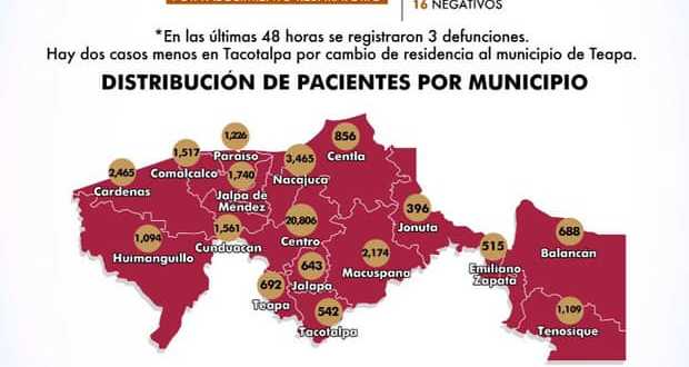 Hasta las 15:00 horas de este sábado, detalla que en las últimas 48 horas se registraron tres defunciones, y se presentan dos casos positivos menos en Tacotalpa por cambio de residencia al municipio de Teapa.