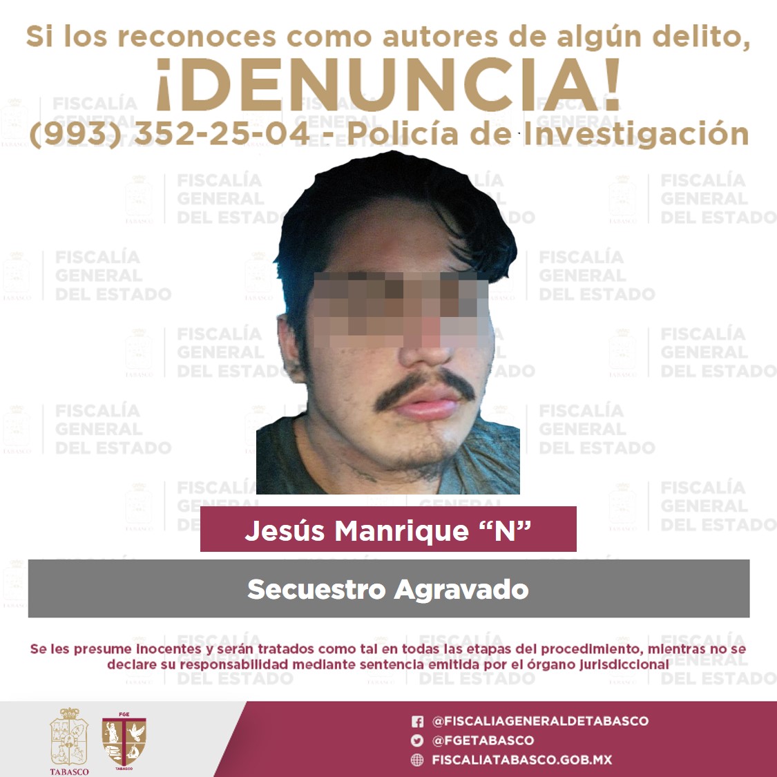 La Fiscalía General del Estado (FGE) de Tabasco aseguró a Jesús Manrique “N”, quien se fugó del penal de Macuspana en mayo pasado, por lo que fue reingresado con el fin de que compurgue la pena por secuestro de la que está acusado.