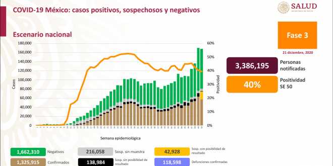 Al 21 de diciembre de 2020 hay 1,325,915 casos confirmados #COVID19. Se han registrado 1,662,310 negativos, 118,598 defunciones confirmadas y 987,328 personas recuperadas.