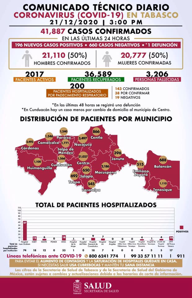 En su Comunicado Técnico Diario, de este lunes, con corte a las 3:00 pm., detalló, que del total de pacientes hospitalizados, 74 se encuentran en el Hospital Regional de Alta Especialidad “Dr. Juan Graham Casasús”; 33 en el IMSS; 18 en el ISSET y misma cifra en el Hospital General de Comalcalco y 17 en la Unidad de Hospitalización Temprana de Tabasco (UHTT) del Parque Tabasco.