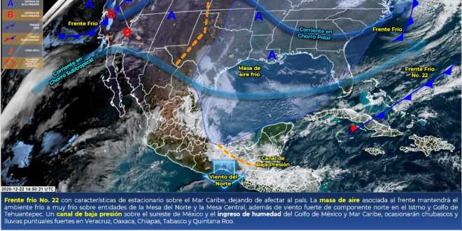 El Instituto de Protección Civil del Estado de Tabasco (IPCET), informó que la masa de aire que impulsó al Frente Frío número 22 y su interacción de un canal de baja presión favorecerá lloviznas de 0.1 a 5 milímetros a lluvias moderadas aisladas de 5.1 a 25 milímetros en la región de Los Ríos y La Chontalpa.
