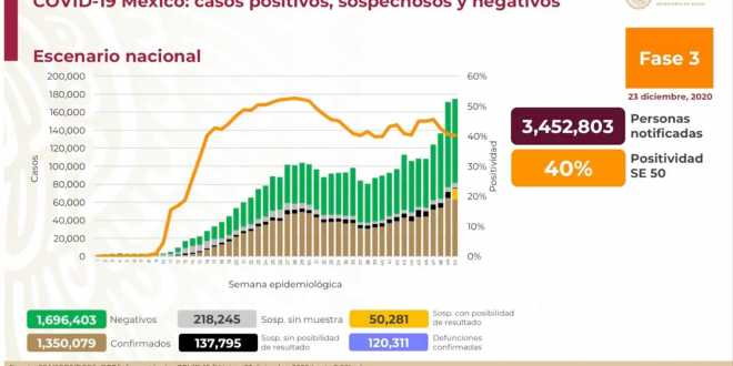 Al 23 de diciembre de 2020 hay 1,350,079 casos confirmados de #COVID19. Se han registrado 1,696,403 negativos, 120,311 defunciones confirmadas y 1,005,248 personas recuperadas.