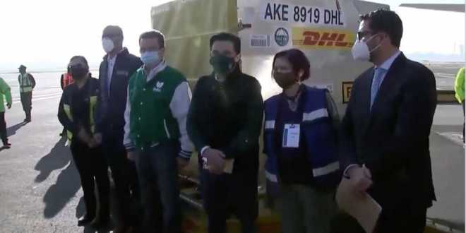El lote fue recibido en el Aeropuerto Internacional Benito Juárez por autoridades federales, entre ellas, el titular del IMSS, Zoé Robledo, luego de que ayer el secretario de Relaciones Exteriores (SRE), Marcelo Ebrard, anunció que esta mañana llegaría este segundo lote de vacunas, mientras que el próximo martes arribará otro más.