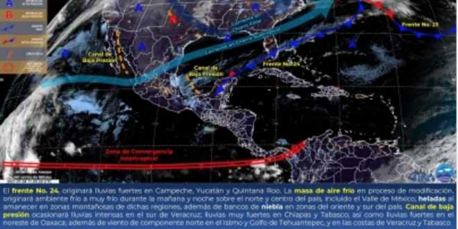 El Instituto de Protección Civil del Estado de Tabasco (IPCET), informó que derivado de la interacción de un canal de baja presión y la masa de aire frio que impulsó al Frente Frío Número 24, para este lunes se esperan lluvias fuertes de 25.1 a 50 milímetros, con algunas muy fuertes aisladas de 50.1 a 75 milímetros.