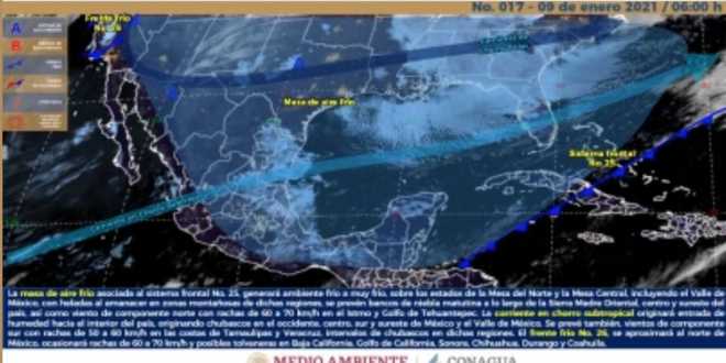 Reportó que en el resto del territorio estatal se prevé cielo parcialmente nublado y bancos de niebla particularmente en las zonas serranas, así como vientos del este y noreste de 20 a 30 kilómetros por hora.