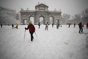 Esquiadores alrededor de la Puerta de Alcalá, en Madrid