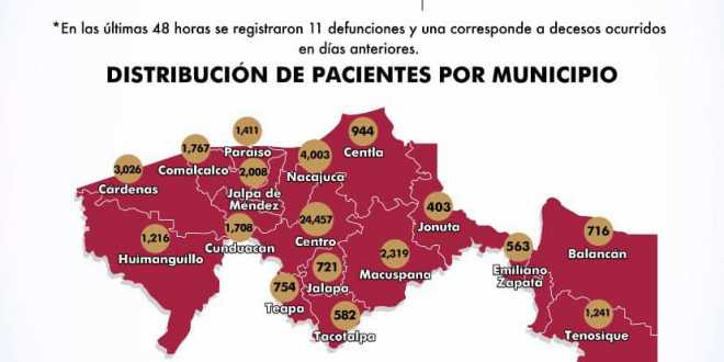 El comunicado indica que la distribución de casos confirmados por municipios, la encabeza Centro, con 24 mil 457, y le siguen Nacajuca, (4 mil tres), Cárdenas, (3 mil 26), Macuspana (2 mil 319), Jalpa de Méndez (2 mil ocho), Comalcalco (mil 767), Cunduacán (mil 708), Paraíso (mil 411), Tenosique (mil 241), Huimanguillo (mil 216), Centla (944), Teapa (754), Jalapa (721), Balancán (716), Tacotalpa (582), Emiliano Zapata (563) y Jonuta (403).