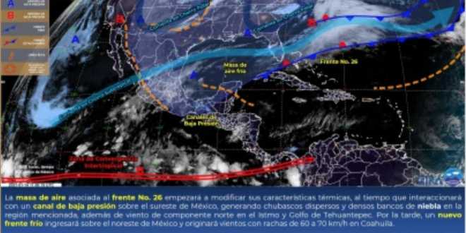 El Instituto de Protección Civil del Estado de Tabasco (IPCET), informó que la masa de aire frío del frente frío número 26 mantendrá algunas lloviznas intermitentes durante la mañana de este jueves, así como un potencial de chubascos aislados de 5.1 a 25 milímetros en Cárdenas, Huimanguillo y la zona costera.