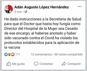 Más tarde, el gobernador Adán Augusto López Hernández destacó a través de sus redes sociales que el director del hospital de la Mujer quedaba destituido de sus funciones por haber violado los protocolos establecidos para este proceso que en primer término está destinado al personal de salud que se encuentra directamente atendiendo a pacientes con el virus SARS-Cov-2.