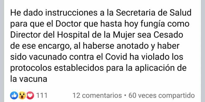 Ayer viernes por la tarde el gobernador de Tabasco, Adán Augusto López Hernández, ordenó la destitución del director del Hospital de la Mujer en Villahermosa, el doctor Germán Corzo Ríos, debido a que infringió los protocolos para la vacunación contra la COVID-19.