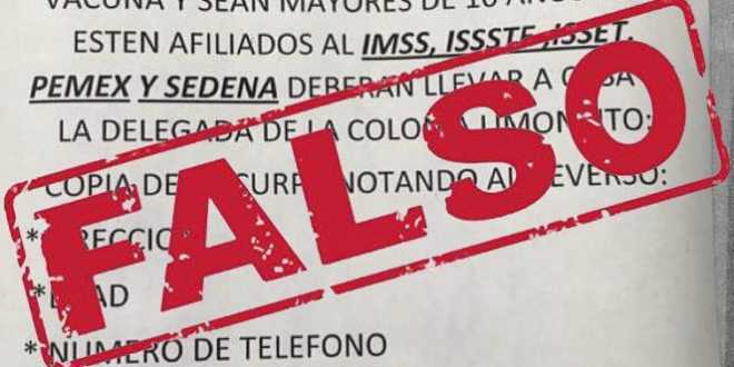 Asimismo, el escrito falso que compartió la Secretaría de Salud en sus cuentas de redes sociales, advierte que «quien no esté inscrito no será vacunado».