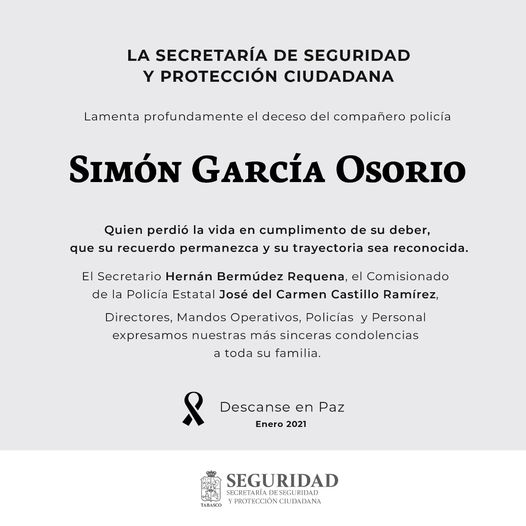 La Secretaría de Seguridad y Protección Ciudadana (SSP) condena y lamenta el homicidio del Policía Simón García Osorio, quien la noche de este jueves 21 de enero perdió la vida en cumplimiento de su deber luego que marcó el alto a una unidad que se desplazaba a exceso de velocidad y al abordar al conductor fue agredido cobardemente con arma de fuego.
