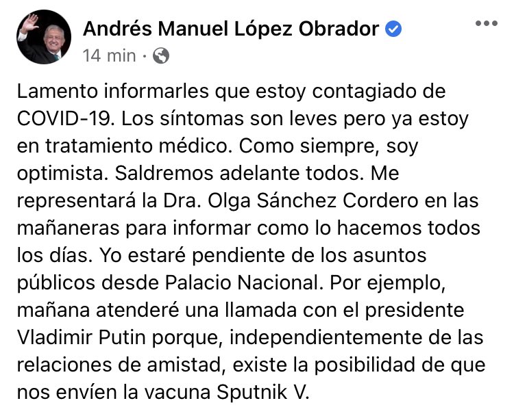 Lamento informarles que estoy contagiado de COVID-19. Los síntomas son leves pero ya estoy en tratamiento médico. Como siempre, soy optimista. Saldremos adelante todos. Me representará la Dra. Olga Sánchez Cordero en las mañaneras para informar como lo hacemos todos los días. Yo estaré pendiente de los asuntos públicos desde Palacio Nacional. Por ejemplo, mañana atenderé una llamada con el presidente Vladimir Putin porque, independientemente de las relaciones de amistad, existe la posibilidad de que nos envíen la vacuna Sputnik V.