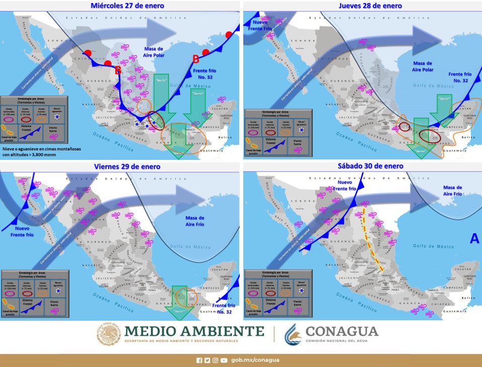 El Frente Frío No. 32 alcanzará al Estado por la noche de mañana, favoreciendo lluvias fuertes a muy fuertes aisladas de 50.1 a 75 mm en Cárdenas, Huimanguillo y Sierra; no se descartan tormentas nocturnas en Pantanos y Ríos. El jueves se prevén lluvias muy fuertes con intensas aisladas de 75.1 a 150 mm en Cárdenas y Huimanguillo; se prevé evento de Norte con vientos sostenidos de 20 a 40 Km/h y rachas de hasta 60 Km/h, así como oleaje de 2 a 3 metros. Lo anterior, principalmente en las costas de Cárdenas.