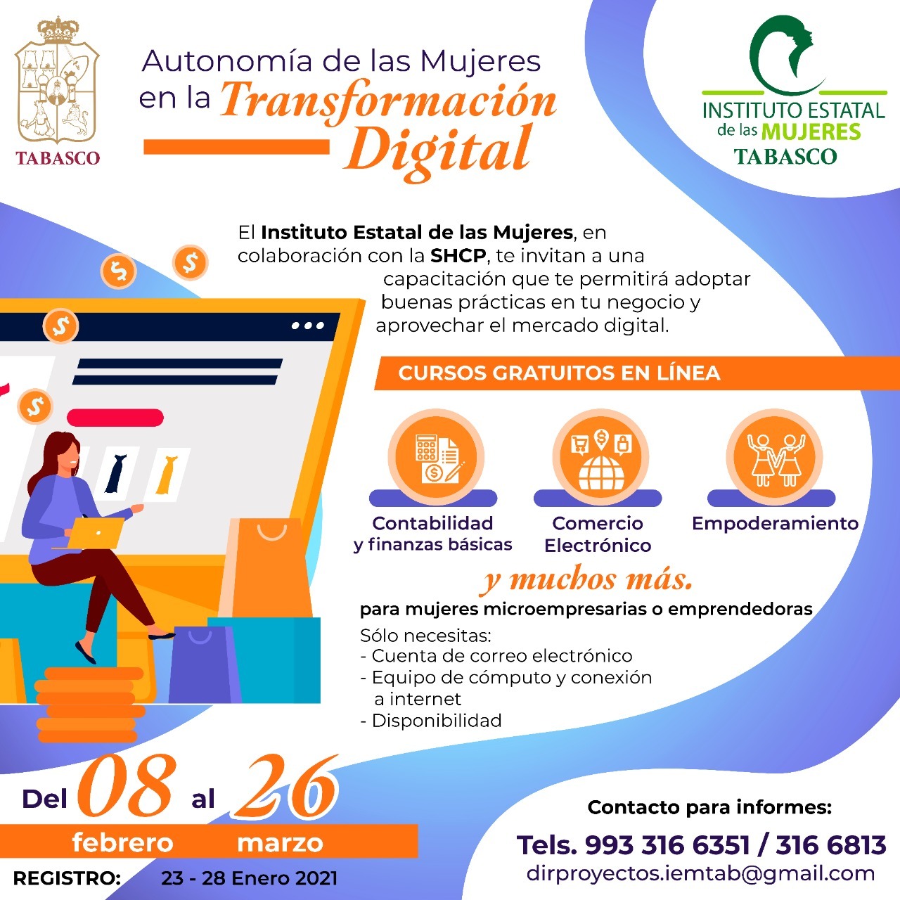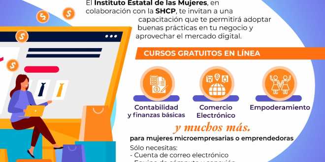 Para brindar alternativas de crecimiento en el mercado digital a mujeres empresarias y emprendedoras, el Instituto Estatal de las Mujeres (IEM) en colaboración con la Secretaría de Hacienda y Crédito Público (SHCP), ofrecerá cursos en línea del 8 de febrero al 26 de marzo de 2021.