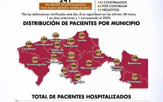 En la numeralia por municipios, Centro acumula 27 mil 111 casos; Nacajuca registra 4 mil 445; Cárdenas, 3 mil 700 personas contagiadas; Macuspana totaliza 2 mil 566 casos; y Jalpa de Méndez, 2 mil 304 casos.
