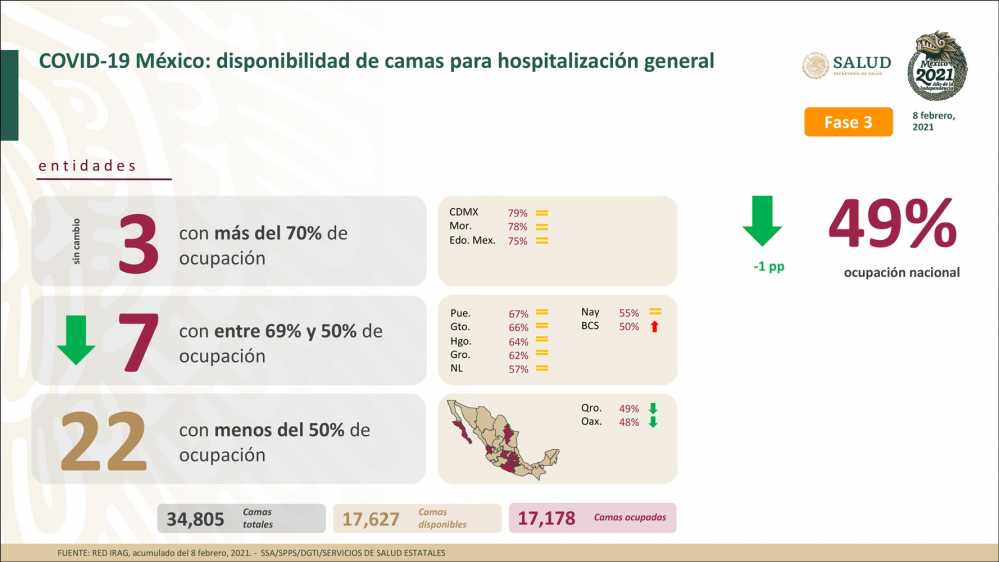 A nivel nacional, 51% de camas de hospitalización general están disponibles y 49% ocupadas. En camas con ventiladores, 54% están disponibles y 46% ocupadas.